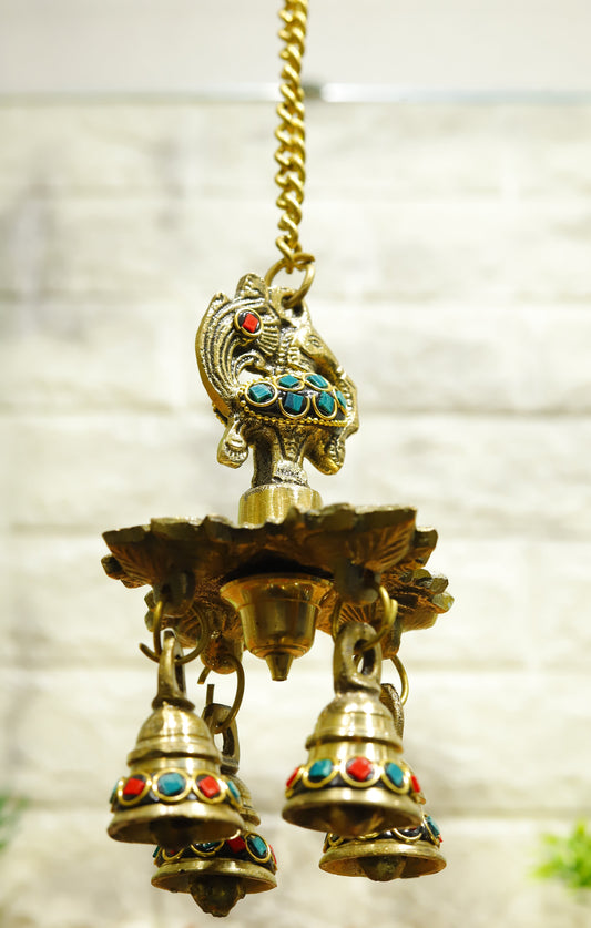 Brass Diya Hanging with Bell and Stonework